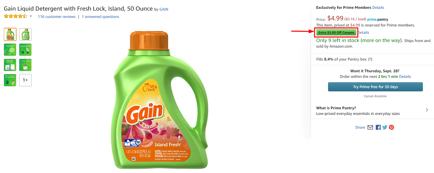 Gain 洗衣精(海島清新味) Amazon Prime會員只要$1.99 by evasdealclub · Published September 21, 2017 · Updated September 21, 2017 Amazon Prime會員只要$1.99 點入減$3.00折扣鍵 即可以最低優惠價$1.99購買 購買連結 更多 Prime Pantry 產品選擇 購買連結 購買5個選擇產品可以減 $6.00 (剛好抵掉$5.99運費=免運費) 還沒參加 Amazon Prime 的朋友歡迎參加 好多優惠折扣都需要 Amazon Prime ★加入 Amazon Prime 申請連結 ★加入 Student Prime (需要edu email) 申請連結 ★點入 Amazon 天天特價區 購買連結 Share