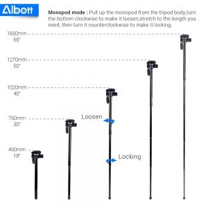 - 3.63磅淨重; 8.8磅負載容量; 4節三腳架21“-70”高度範圍; 可調節的中心列轉換成5節獨腳架18“-65”高度範圍