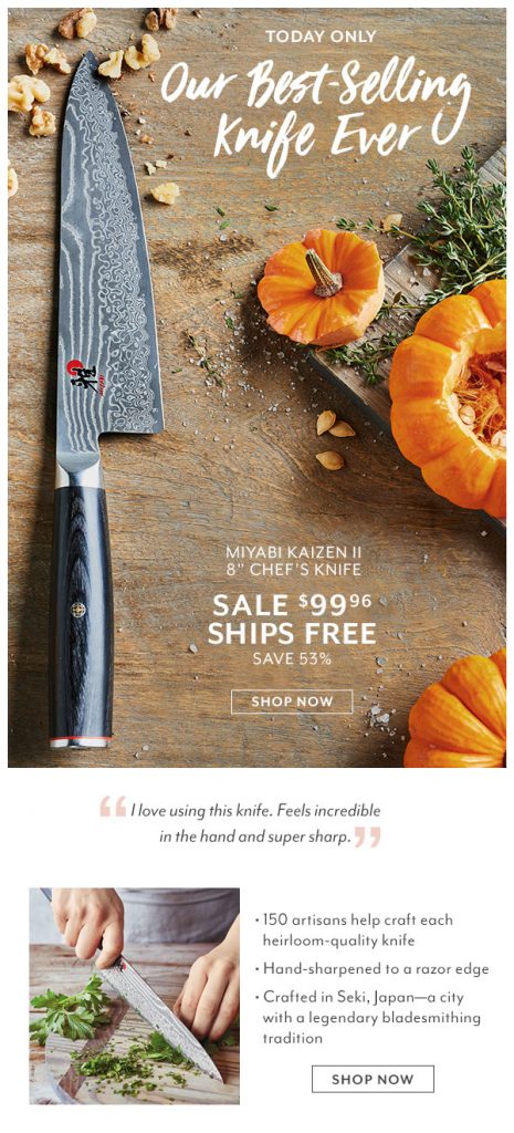 日本名牌 Miyabi Kaizen II 8″ 手工製造主廚刀 特價$99.96+免費送貨 (只有今天) by evasdealclub · October 31, 2017 Sur la table 定價$215.00 特價$99.96 購買連結 促銷折扣碼 SHIPFREE 免費送貨 產品介紹 Sur la table 最暢銷廚師刀 ! 完全在日本手工製作 從FC61鋼由不銹鋼48層包圍的芯偽造 終身保修 專家評審 Share