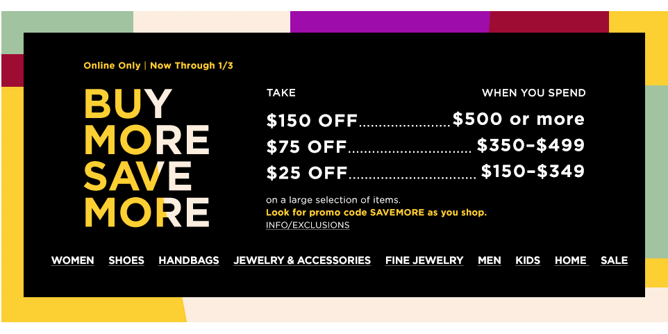Bloomingdale’s 買多省多促銷 by evasdealclub · January 2, 2018 Bloomingdale’s 多種商品 (標有SAVEMORE 折扣碼) 購買連結 購買超過$150 獲得$25折扣 購買超過$350 獲得$75折扣 購買超過$500 獲得$150折扣 Bloomingdale’s 買多省多促銷至1月3日。 Bloomingdale’s Loyalist 會員有免運費資格。 成為會員是免費的,並且可以獲得獎勵積分。每次達到5千獎勵積分,可以換取 $25 Bloomingdale’s 獎勵卡。 Bloomingdale’s Loyalist 會員 註冊連結 Share