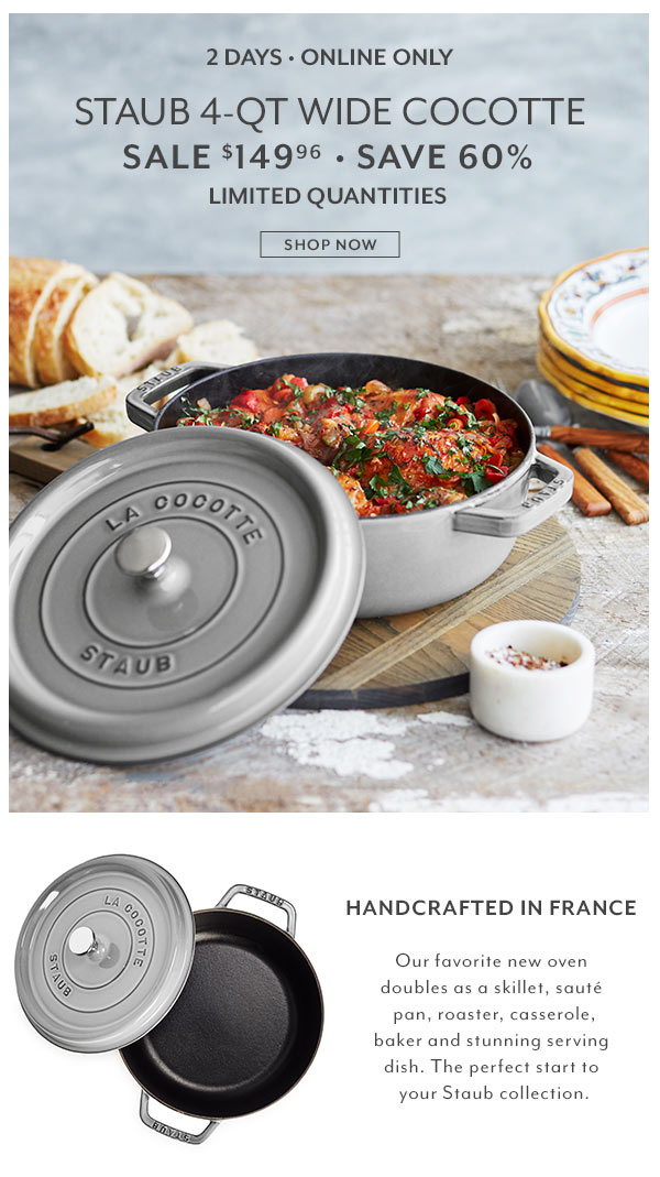 Staub Round Wide Cocotte 4Q 特價$149.96+免運費+滿$200送可愛動物頭 (僅剩2天) by evasdealclub · Published January 7, 2018 · Updated January 7, 2018 Sur la table 定價$379.00 特價$149.96 購買連結 促銷有效期至1月8日。 使用Eva特別黑五促銷折扣碼 SHIPFREE 可以免運費。 特別優惠:購買價值$200的Staub炊具時,可以申請免費可愛動物裝飾頭(價值$43)優惠表格下載 更多其他Sur la table Cabin Fever 促銷商品高達70%折扣 購買連結 可愛動物頭申請表格 哈哈哈!Eva收集好多動物頭。lol Share