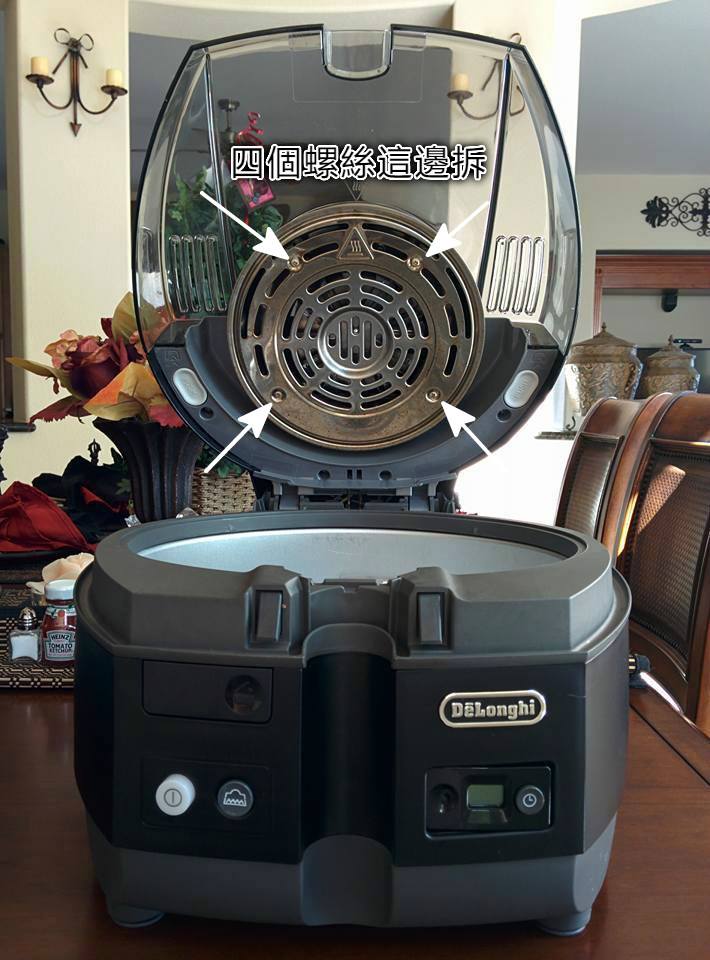 1.Delonghi Multifry 胖帝清潔非常容易,打開上蓋,上蓋風扇和燈管前面有個擋油板。