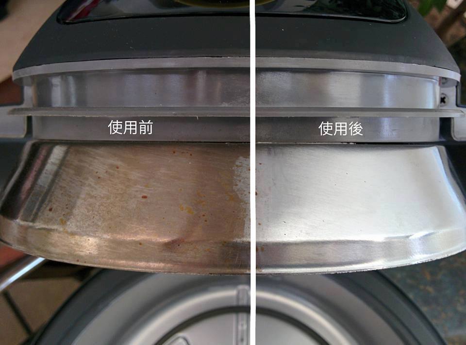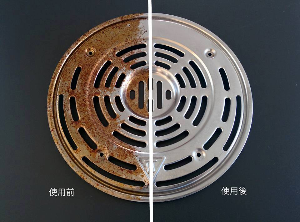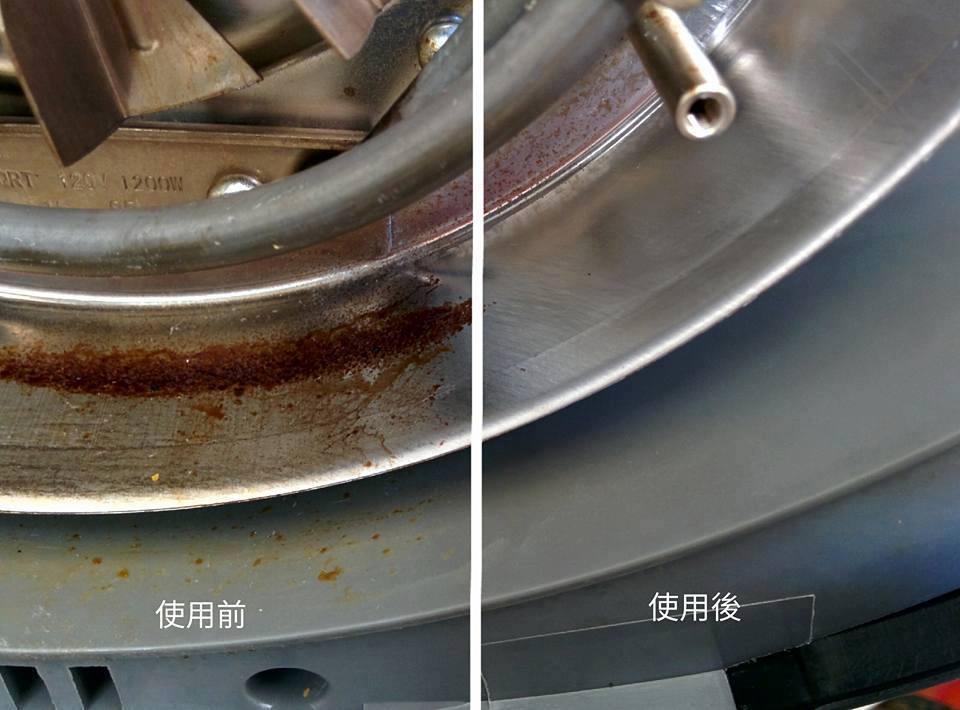 2.擋油板氣炸爆米花兩次,隔了兩個星期的油垢 ,Eva直接用電鑽裝鋼絲刷頭刷(省的出力XD),也可以直接用金剛刷或是多用途強效菜瓜布海綿,配合 Bar Keepers Friend Liquid Cleanser 清潔…啵亮的很^^y