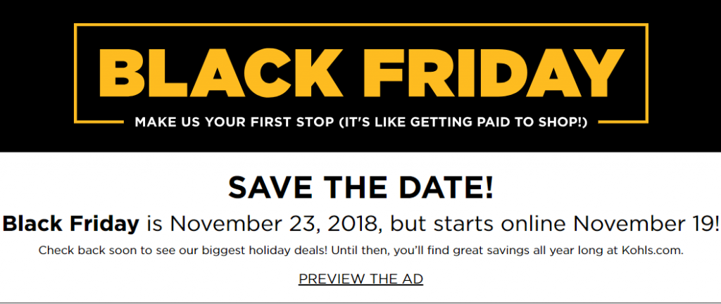 Kohl’s 黑五促銷在店裡11月23日開始, 但促銷商品可以11月19日線上提前購買。 就不需要當天在商店排隊或怕買不到!