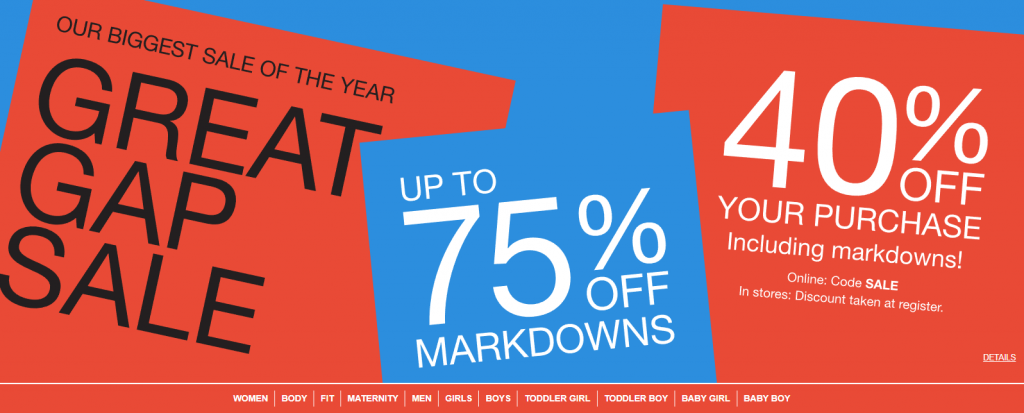 Gap 全年最大促銷 高達75%折扣+額外40%折扣 特價$2.39起 by evasdealclub · Published January 4, 2019 · Updated January 7, 2019 Gap 全年最大促銷所有減價商品高達75%折扣 Eva特別促銷折扣碼 SALE 再減40% 折扣碼有效期至1/7。 男裝 購買連結 女裝 購買連結 Love By Gapbody 女裝內衣和睡衣 購買連結 Gapfit 健身服 購買連結 孕婦裝 購買連結 男孩 購買連結 女孩 購買連結 男童裝 購買連結 女童裝 購買連結 男嬰兒 購買連結 女嬰兒 購買連結 免運費當你訂單滿$50。 Share