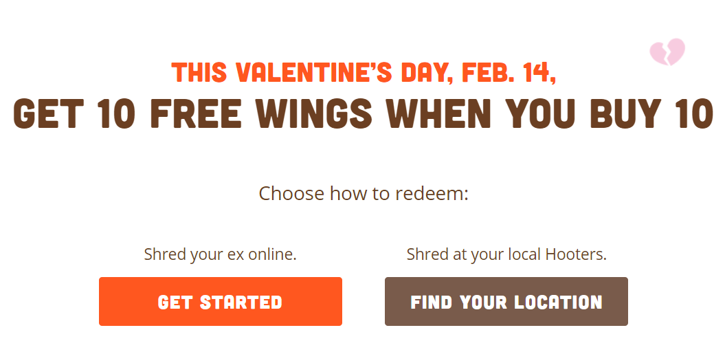 【情人節優惠】Hooters 買10隻雞翅送10隻! by evasdealclub · Published February 14, 2019 · Updated February 14, 2019 在 Hooters 餐廳購買10隻雞翅送10隻! 優惠只限今天。必須在餐廳用餐。 Hooters 餐廳 搜索連結 Share