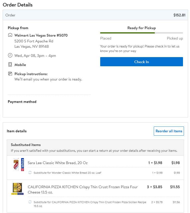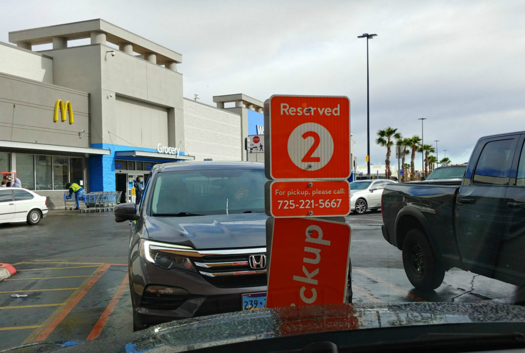 在Walmart生鮮網站購買後,再到停車場提貨,完全不用自己下車冒險選購,也不用開窗口。到停車場的時候,只要需要用 Walmart Grocery app 辦報到,輸入自己在幾號停車位和車子的顏色。然後打開後車箱,服務員會將食物放好和關車廂門。真心感謝Walmart有這項服務!