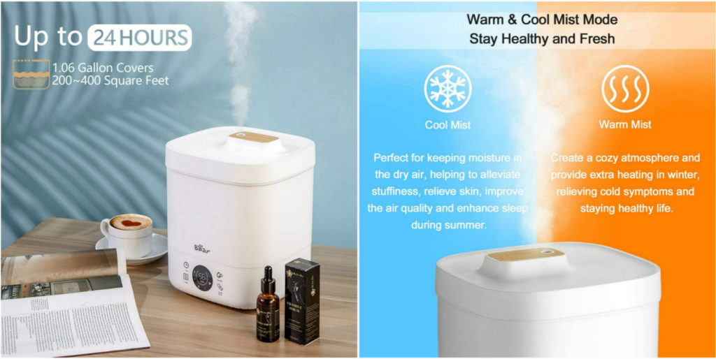 - 配備4升(1.06加侖)水箱的這款薄霧加濕器可在家庭,臥室,嬰兒托兒所或辦公室中長達24小時的薄霧工作。