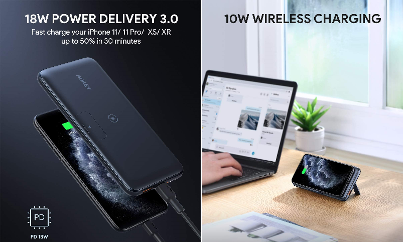 AUKEY 10000mAh 18W PD/QC3.0 可直立無線/有線隨身充 歷史低價$26.99