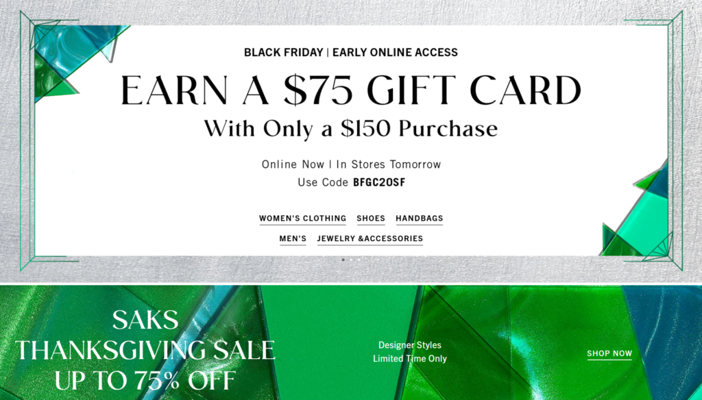 多種商品折扣高達75%。使用Eva特別促銷折扣碼 BFGC20SF 消費滿 $150 送 $75 Saks Fifth Avenue 禮品卡!