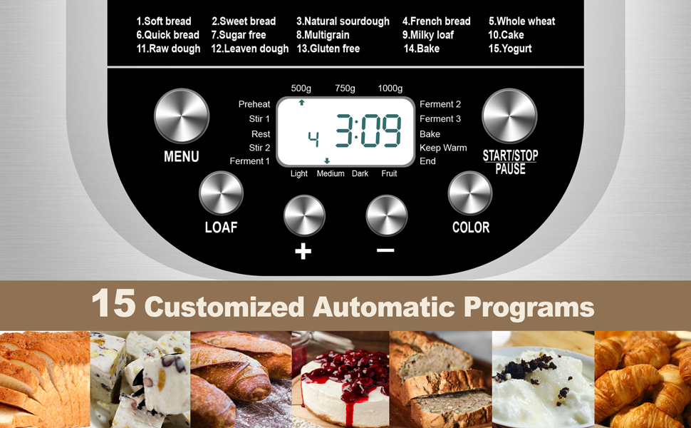 - 15個設置預設程式:麵包機的機器有15個設置,包括牛奶麵包,全麥,無麩質麵包和法式麵包,蛋糕和酸奶等,以您喜歡的方式自定義您的麵包或其他美味食物。