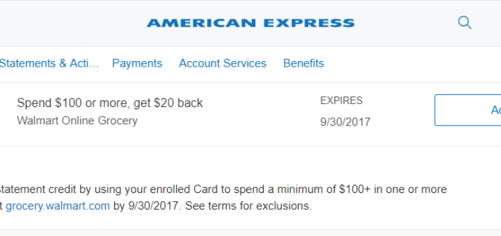 Amex Offers / 超值促銷 August 16, 2017 by evasdealclub · Published August 16, 2017 · Last modified August 17, 2017 Amex Offers 購買 Walmart 網上雜貨類$100元-$20元