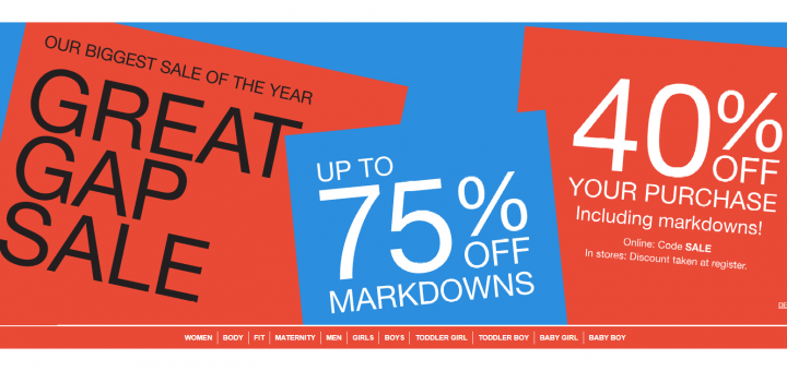 Gap / 流行服飾 / 超值促銷 January 4, 2019 by evasdealclub · Published January 4, 2019 · Last modified January 7, 2019 Gap 全年最大促銷 高達75%折扣+額外40%折扣 特價$2.39起