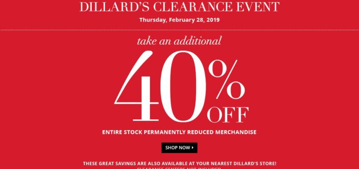 Dillard's / 時尚百貨 / 超值促銷 February 28, 2019 by evasdealclub · Published February 28, 2019 【Dillard’s 清貨促銷】所有減價商品再減40%額外折扣 (只限今天)!